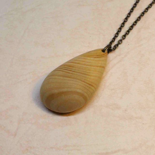 少しうねりの入った珍しい形状の一点です。見る角度により様々な表情を見せてくれます。 年輪が緻密な杉の枝材を丁寧に手作業で削り出した一品物です。 チェーン(シルバー色)40cm。 ペンダントトップ 約50 × 15 × 10mm。
