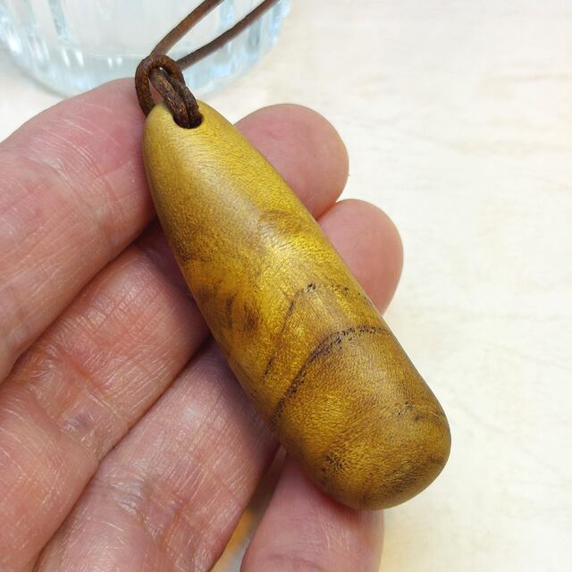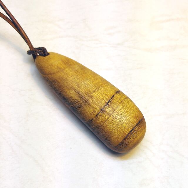 長期乾燥させたハゼノキの心材を丁寧に削り出した、やや大ぶりで存在感のある一品物のペンダントです。独特の深い色合いが特徴で、角度により金色に輝いて見えます。