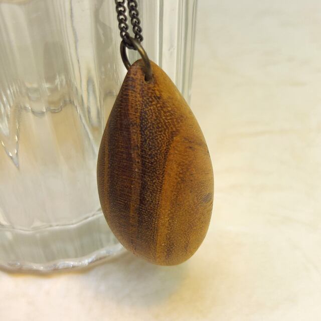 ころっとした丸っこいフォルムが可愛い一品物のペンダントです。長期乾燥させたハゼノキの心材を丁寧に削り出しました。独特の深い色合いと斜めに走るストライプが特徴で、角度により違った表情を見せます。